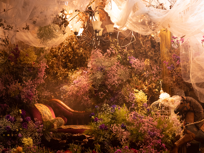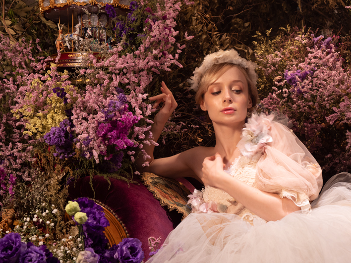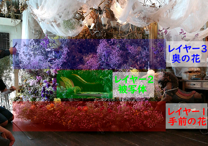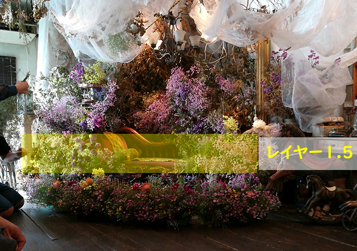 さらにこの3層のレイヤーの中にレイヤー1.5を入れ込むとモデルとの間に切れな前ボケを作ることができるそうで、大きめの花を挿し込んでいきます。