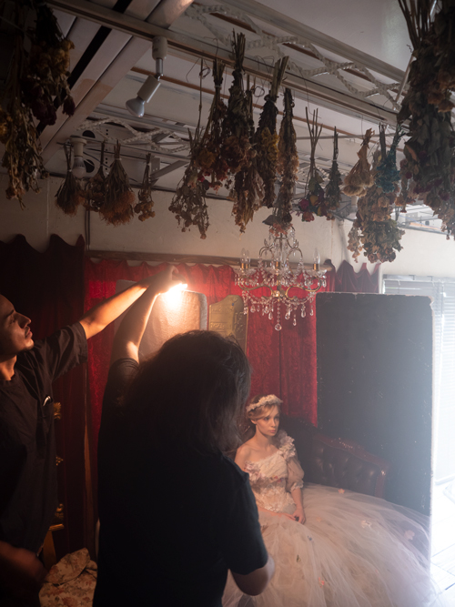 今回は定常光での撮影のようなのでストロボは見当たりませんでしたが、天井から色温度の低いライトがセットを照らしています。