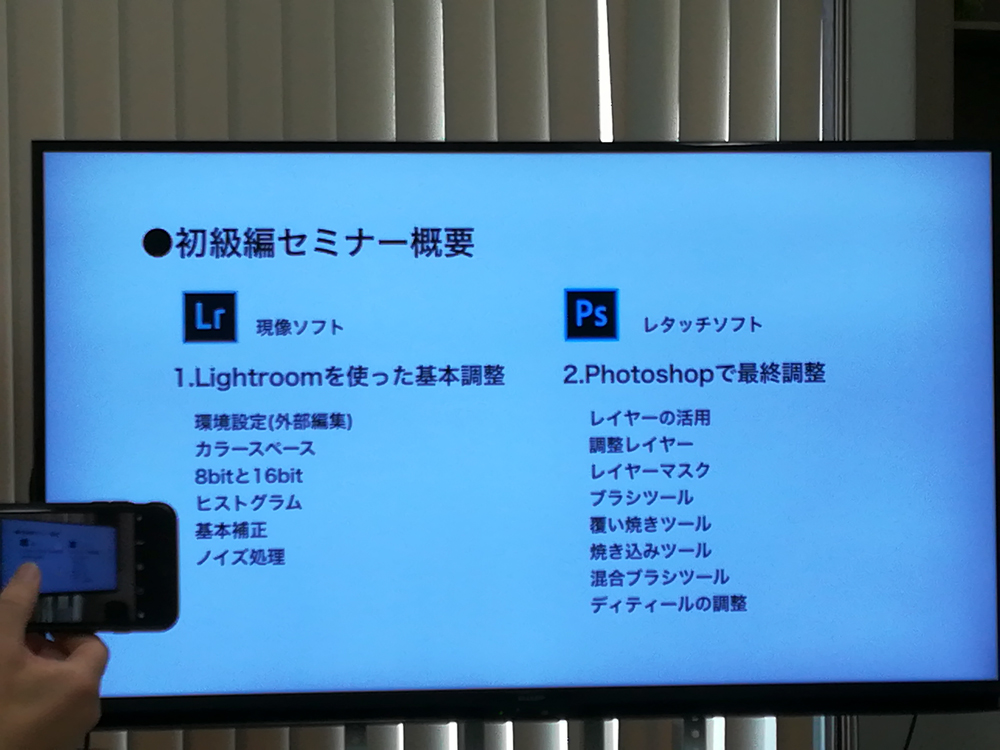 参加者のソフト使用経験をヒアリングしてましたが、午前の撮影セミナーの時はすごいベテランぽい人でも意外にPhotoshopは触ったことないとかLightroomも軽くやってるだけという人がほとんどでブランクがあるとはいえ自分が一番触れるんじゃないかと思うほど皆さん撮影のみに力入れてるように感じました。