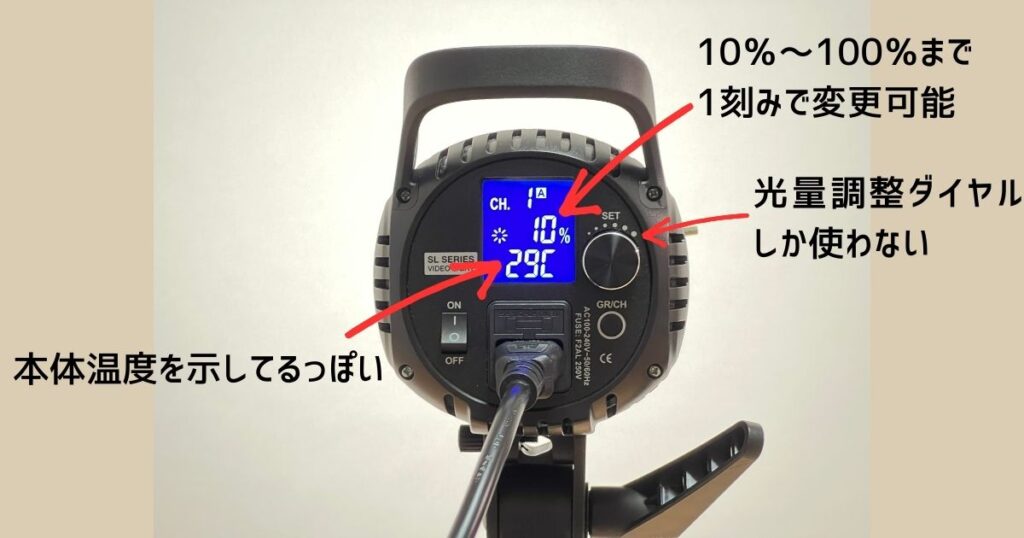 光量の上げ下げに関しては、本体のダイヤルで調整した方が早い。