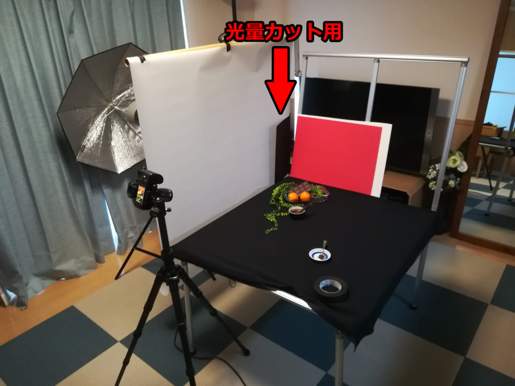 1灯しか使用してないので特に難しいライティングではないと思いますが、1つポイントとしてはこのまま照射するとアートレを透過した光が直に当たって赤いはずの背景が朱色になってしまいますので光量をカットするための黒い背景紙をセットします。