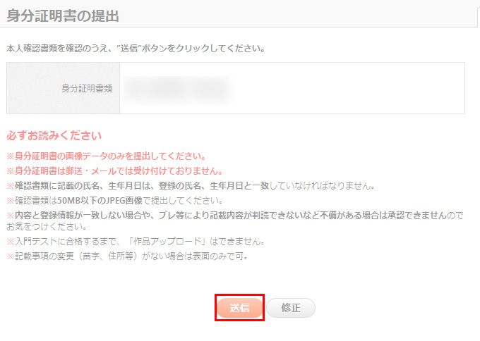 以下の画面で身分証明書類の提出データに誤りがなければ送信しましょう。