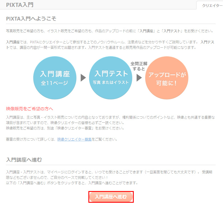 対して、写真販売するためのテストは、簡単なテキスト講座を受講して入門テストに全問正解する事が必要となります。
