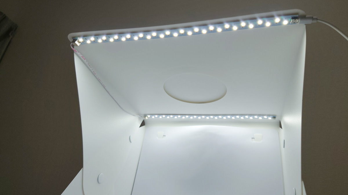 撮影ボックスの天井にはLEDの連続した光源がずらりと並んでいます。