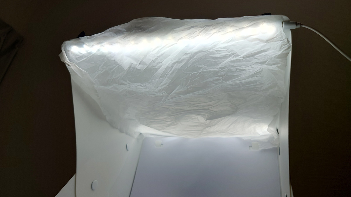 以上のように、撮影ボックスの照明を拡散させたり、部屋の天井照明を消すことでだいぶ映り込みが少なくなったと思います。
