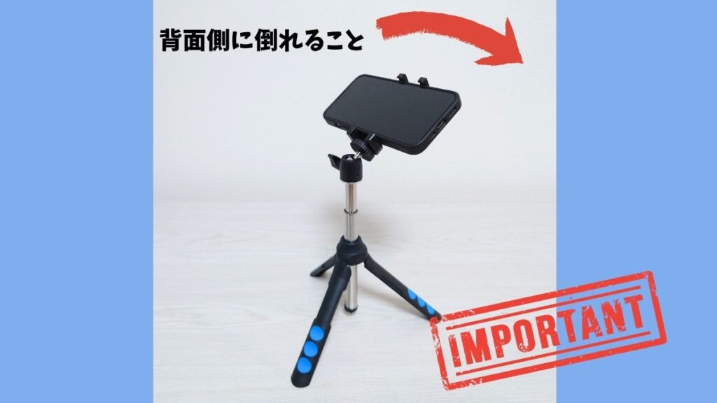 最適な三脚を選ぶためのポイントは、スマホを背面に傾けることが可能で、液晶が見える位置で固定した時に背面カメラ側が商品側に向かうものを選ぶことです。